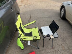 “I created an office of sorts in the parking lot of a Baptist church with a folding table, a chair and my laptop. It wasn’t the most ideal setting, but I made the most of it and was able to grade homework assignments and communicate with students.”